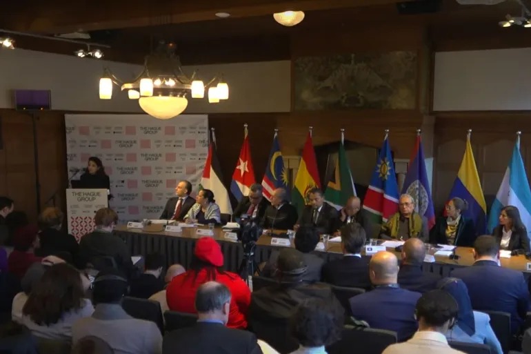 وفي بيان مشترك، قالت كلّ من بيليز، وبوليفيا، وكولومبيا، وكوبا، وهندوراس، وماليزيا، وناميبيا، والسنغال، وجنوب أفريقيا، إنها "تسترشد بأهداف ميثاق الأمم المتحدة ومبادئه"، مشددة على أن حق الشعوب في تقرير المصير لا يمكن التنازل عنه. وقال نائب وزير العلاقات الدولية في جنوب أفريقيا خلال مؤتمر صحافي في لاهاي: "لقد اجتمعت هذه المجموعة من البلدان النامية للاتفاق على برنامج تحرك، هدفه الدفاع عن مؤسسات الحكم العالمي، بما في ذلك المحكمة الجنائية الدولية ومحكمة العدل الدولية".