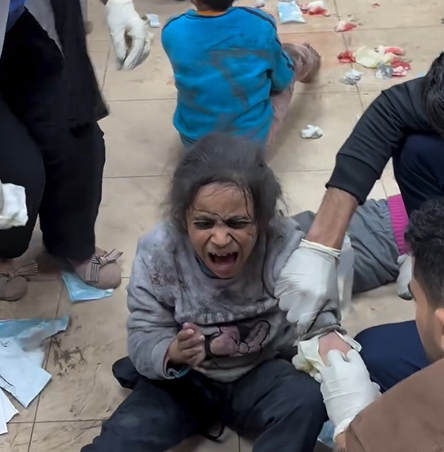 قام طيران الاحتـ-لال الإسرا-ئيلي بشن سلسلة غارات جوية على مناطق متفرقة في محافظة دير البلح بتاريخ 23/2/2024، وكان الأطفال بإصابات خطيرة هم ضحايا هذا القصف، فكانوا يصرخون من الألم لعدم وجود مسكنات أو علاجات مناسبة وهم على أرض المستشفى لقة الإمكانيات مع وجود الدماء والنفايات الطبية والتلوث؛ بسب الحصار الذي يعانيه قطاع غزة وقيام الاحتـ-لال الإسرا-ئيلي بإغلاق المعابر وقطع الكهرباء والإمدادات الطبية عن المستشفات ما أدى إلى تكدس الشهداء والمصابين في مكان واحد.