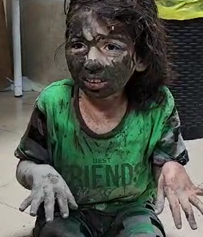 الطفلة جنى وصلت بتاريخ 11/6/2023 المستشفى مصابة بحروق في كامل جسمها، تتلقى الفحوصات على الأرض بسبب كثرة عدد المصابين التي تصل للمستشفى بعد قصف الطيران الحربي الإسرائيلي لمنازل المواطنين .