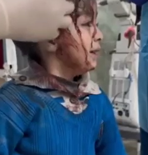 طفل مصاب إثر قصف طيران الاحتـ-لال الإسرا-ئيلي بتاريخ 12/2/2024 لمسجد الهدى وسط مخيم يبنا في محافظة رفح.