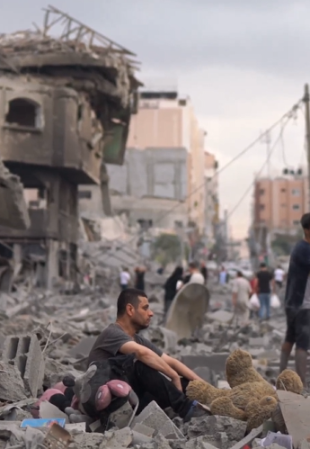 شاب يجلس على ركام منزله ومحله – غزة