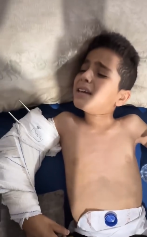 كنان عياش 10 سنوات استشهدت أخته لارا و أصيب أخوه احمد لديه تفتت في يده و شظايا كل انحاء جسمه.