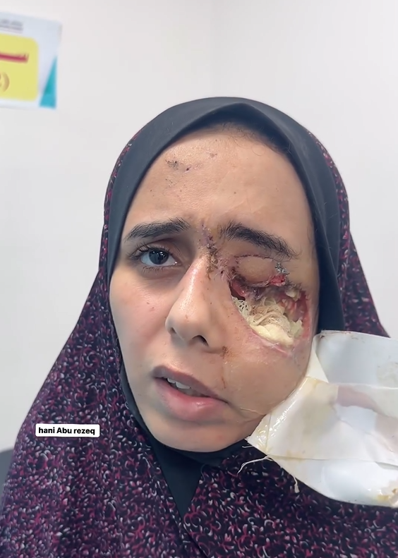 فقدت عينها في إصابة خطيرة بسبب قصف الاحتـ-لال لمنزلها في مخيم النصيرات دون سابق إنذار، كما قتل العديد من أفراد أسرتها من النساء والأطفال.